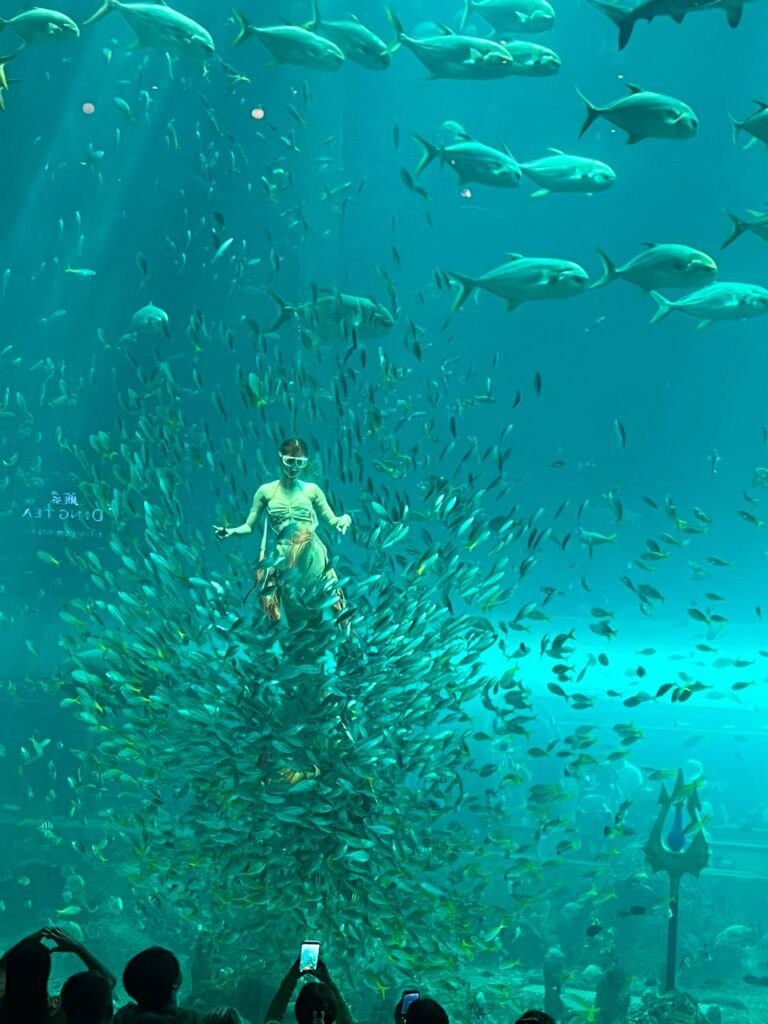 Океанариум огромный. Пройдитесь по подводным туннелям, посмотрите на гигантских рыб, акул, медуз, пингвинов и других обитателей водного мира. Хотите шикануть – отправляйтесь в подводный ресторан с видом на главный аквариум – оттуда сможете посмотреть и шоу русалок.