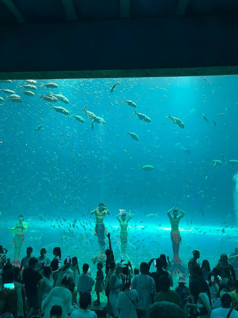 Океанариум огромный. Пройдитесь по подводным туннелям, посмотрите на гигантских рыб, акул, медуз, пингвинов и других обитателей водного мира. Хотите шикануть – отправляйтесь в подводный ресторан с видом на главный аквариум – оттуда сможете посмотреть и шоу русалок.